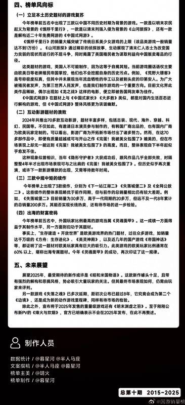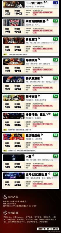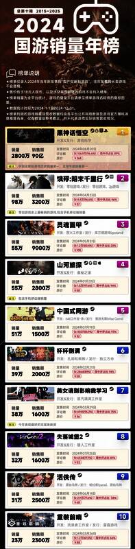 1月10日,2024年国游销量榜正式发布,该榜单统计了2024年1月1日至2024年12月31日之间发售的国产买断制游戏销量,数据主要来自公开网络数据和官方爆料消息推算,仅具有数量级参考意义,不代表游戏实际销售营收情况。
