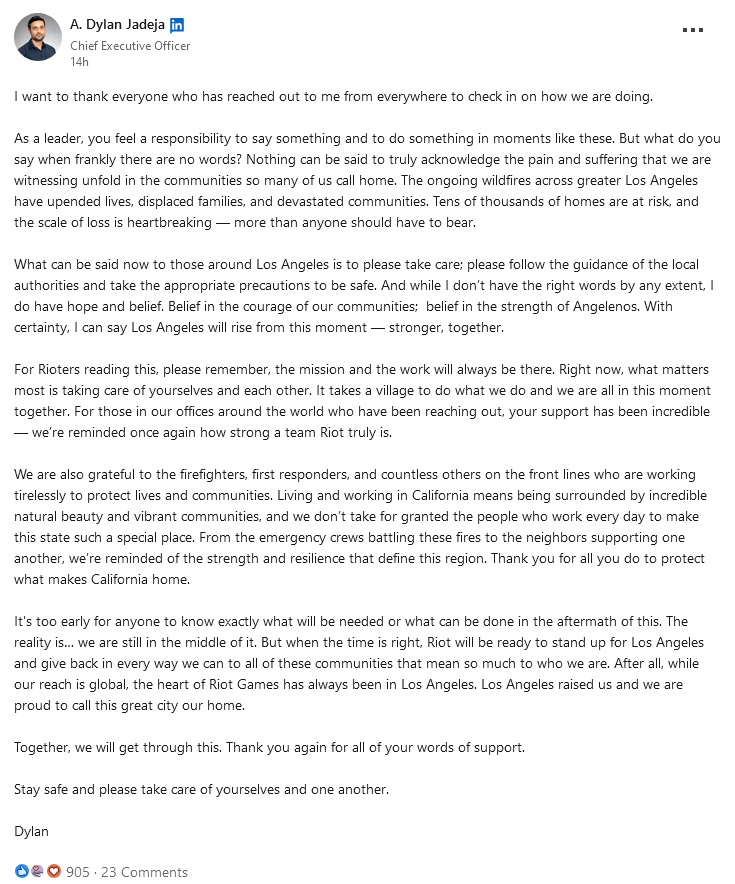 “对于所有人来说现在还不能够清楚的知道灾后我们能够做些什么。事实是……我们仍处于灾难当中。但当时机成熟时,拳头游戏将准备好为洛杉矶挺身而出,并以一切方式回馈这个对我们来说意义重大的社区。”