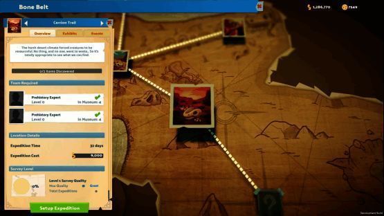 当然,这些类型各异的展品自然不能靠玩家们凭空创造。相比于前两作,这次的《双点博物馆》在设施内部建设的玩法之外,还增添了以远征和探索玩法为主的内容。玩家需要雇佣专家,组建一支探险队去不同地区找寻不同类型的文物展品。而在探险途中,专家们也会在每个地点触发对应的特定事件。他们会从中提升自己的经验值,或者因此染病,从而无法进行探索,整个过程充满了未知。