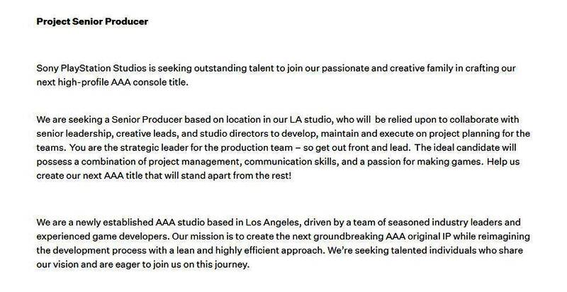 根据索尼的一份高级制作人招聘启事显示,索尼已经在美国洛杉矶建立了一家新AAA游戏工作室,目标是开发一款备受瞩目的AAA主机游戏。