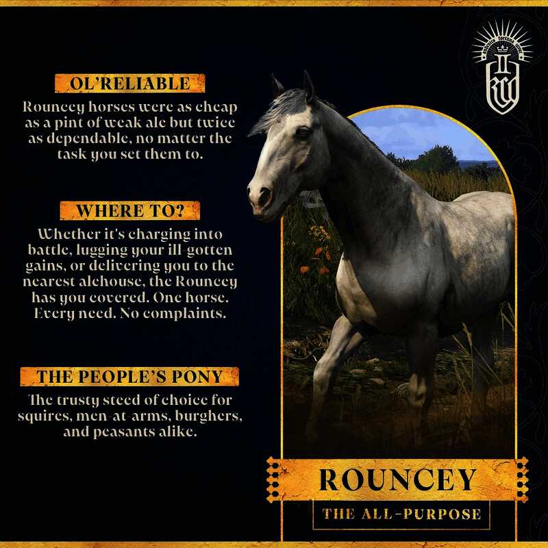 近日Warhorse工作室透露了《天国:拯救2》马匹新细节,每一种马都具有自己的特色。官方介绍了三种类型的马匹:通用马(Rouncey)、骏马(Courser)和战马(Destrier),一起来看看吧!