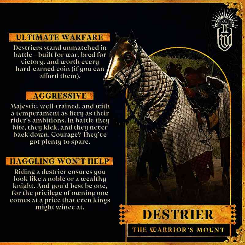 这种马匹非常强力,专为打击敌人而生,它们代表着奢华和尊贵。那些想在游戏中彰显自己地位的玩家,通常会选择它们。