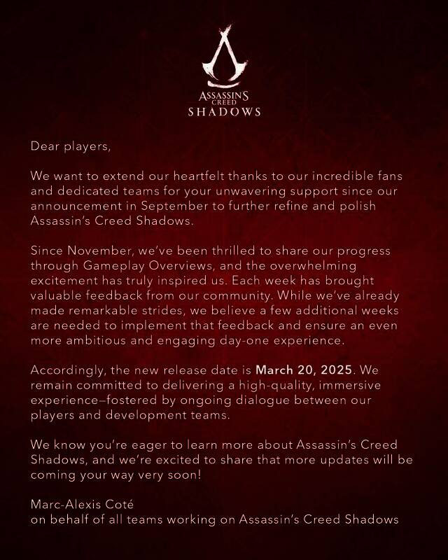 这是《刺客信条:影》第二次延期,育碧希望多出来一个月时间,能让本作变得真正符合玩家期待,也希望其能惊艳大部分玩家。游戏制作人Marc-Alexis Cote表示:“虽然我们已取得显著进步,但我们认为还需要几周时间来落实玩家反馈意见,以确保游戏首发体验更具雄心和吸引力。”