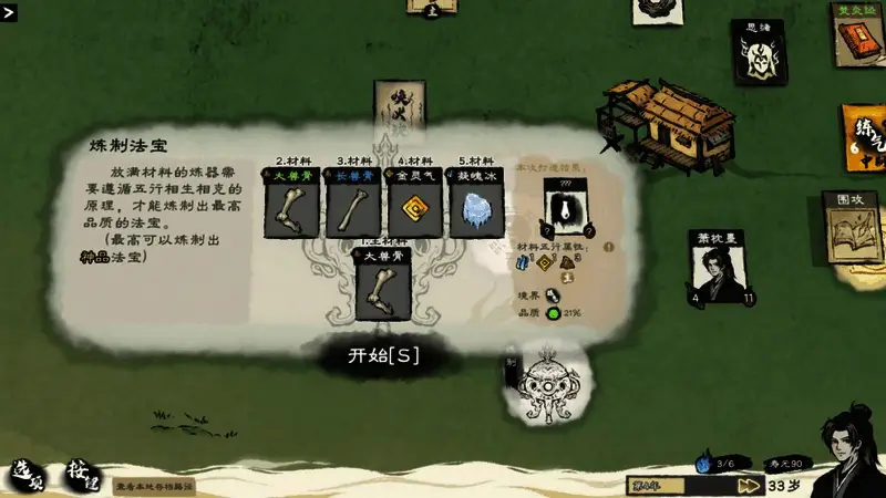 游戏中的“工作台”对应着玩家可在游戏内可施展的各类“行动”,玩家可在“工作台”投放材料,打造各类极品法器、炼制灵丹妙药、或培育灵兽。此外,玩家亦可就地修行,通过“工作台”参悟功法口诀,一步步精进自身修为,使修行之路愈加顺遂。