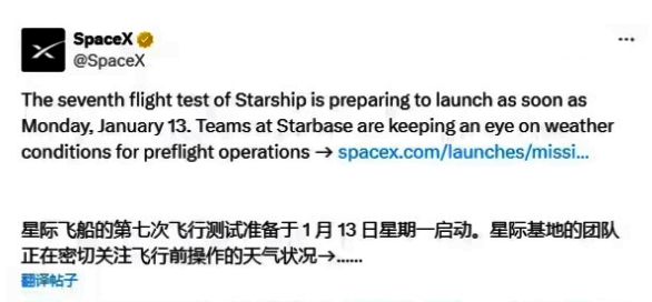 快科技今日(1月9日)消息,SpaceX今天宣布,将在北京时间下周二(1月14日)06:00 开启星舰第七次试飞任务(IFT-7)。