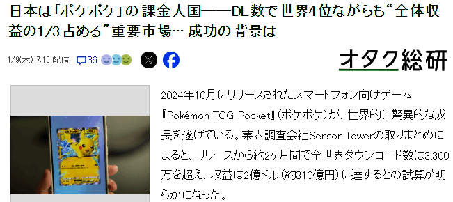 2024年10月,宝可梦公司推出了数字版的集换式卡牌游戏《宝可梦卡牌P》,迅速引发玩家追捧,据统计2月月收益就达到了2亿美元,其中日本玩家贡献收益四成,一起来看看日媒的分析什么让日本玩家热衷氪金。