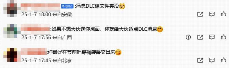 还有玩家期待DLC的公布,“你就给大伙透点DLC消息吧!”“能不能看见DLC或者新作预告,新年有点盼头”“冯总DLC建文件夹没?”“有没有DLC预告?”