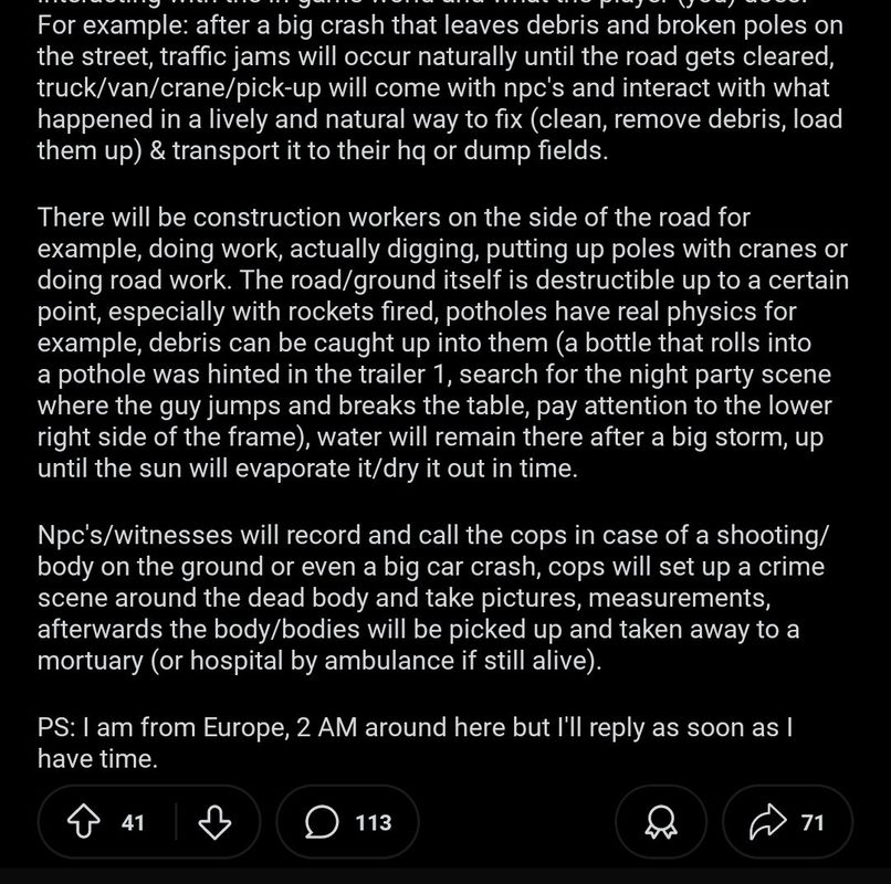 这位测试者表示,《GTA6》世界中有大约90%的物体能进行交互,比如垃圾碎片和被汽车压碎的杯子。NPC会对环境和玩家行为做出反应。比如发生重大交通事故后,街道上会出现维修和清理人员,他们会清除垃圾、修复损坏的电线杆,疏通交通。这些人会使用起重机、卡车和其他机械进行工作,并与周围自然互动。