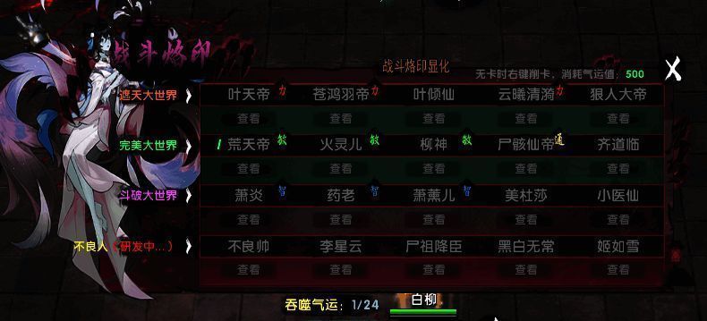 战斗烙印是游戏核心,关乎流派走向。集齐一套卡组,就能获得一套被动技能,可容纳24张卡牌,身上携带6张。力量对应遮天大世界,敏捷关联完美大世界,智力对接斗破大世界。每套被动需6张卡牌,千万别乱吃,从五个卡组中选4套,吃错可用气运去除。抽卡若未抽到心仪卡牌,50气运刷新,100气运重抽,超100就点X重抽,牢记只生效4套被动,掌握此玩法,游戏之路顺遂。