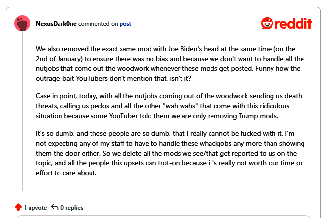 ·官方表示接受玩家意见不再发布此类MOD,也奉劝已经拥有该MOD的玩家谨慎使用。