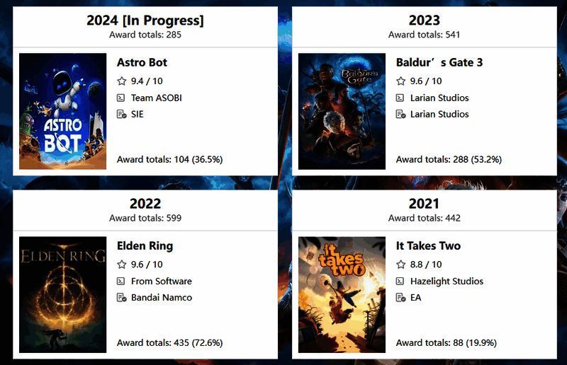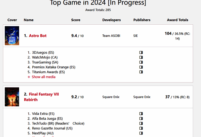 索尼互娱旗下沙盒动作冒险名作《宇宙机器人》称得上2024年最风光游戏亦不为过,根据外媒最新统计,2024年获年度游戏104次,占据全球所有285个奖项的三成多。