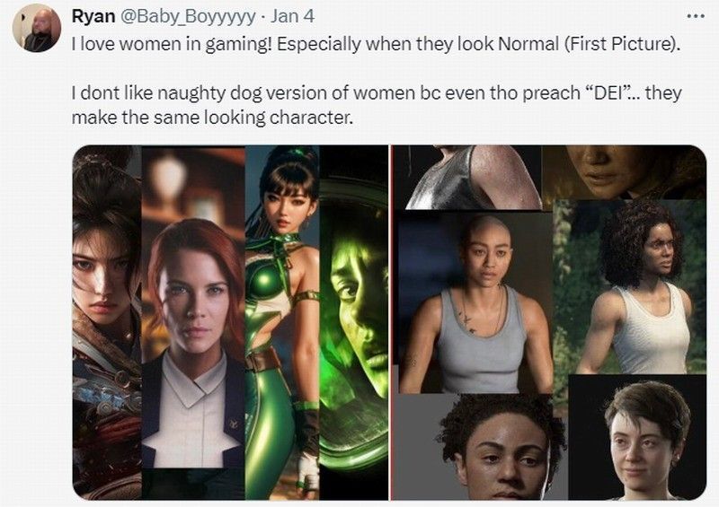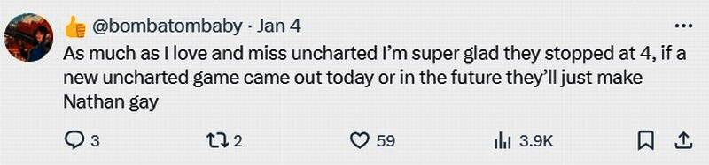 在评论区,有网友表示:“还好《神秘海域》只出了四代。如果未来有《神秘海域》新作问世,他们会让男主变成同性恋的”。还有人表示:“我喜欢其他游戏中正常女性,不喜欢顽皮狗现在的游戏女性,由于宣传DEI……她们看起来很丑。”