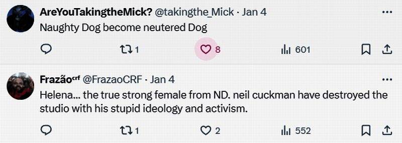“真的很想念顽皮狗老一辈人。”“顽皮狗正试图效仿育碧。”“尼尔正在用他愚蠢的意识形态和激进主义摧毁顽皮狗工作室。”“伊莲娜真漂亮,光头女人输得很惨。”