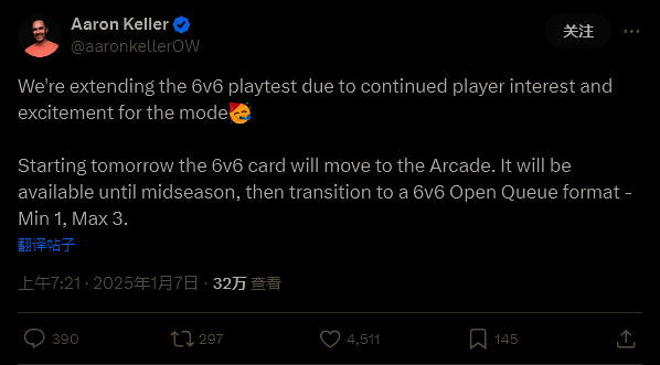 今天(1 月 7 日),《守望先锋2》总监 Aaron Keller 在社交媒体上宣布,由于玩家的喜爱,6v6 模式的第二轮测试将延长。具体结束日期尚未确定,但他确认 6v6 测试模式将被移入“街机”模式。之后将在“赛季中期”过渡至正常匹配。该模式下职业依然有限制,每个职业最少有 1 名,上限为 3 名。