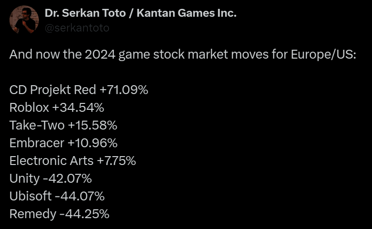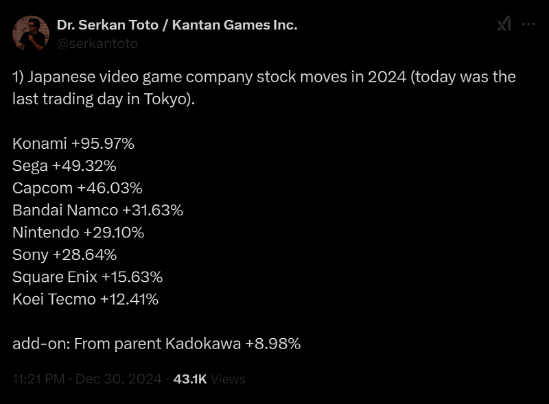 根据 Kantan Games 分析师 Serkan Toto 分享,日本电子游戏公司在 2024 年的股市表现大幅领先欧美公司。其中,由于《寂静岭2:重制版》的热销,科乐美股价涨幅 95.97%位居第一。