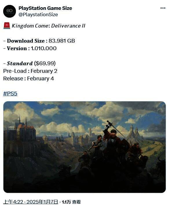 根据知名爆料推主PlaystationSize的最新消息,《天国:拯救2》PS5版下载容量大小为83.981GB,版本号1.010.000,预计2月2日开启预载,2月4日正式解锁发售。