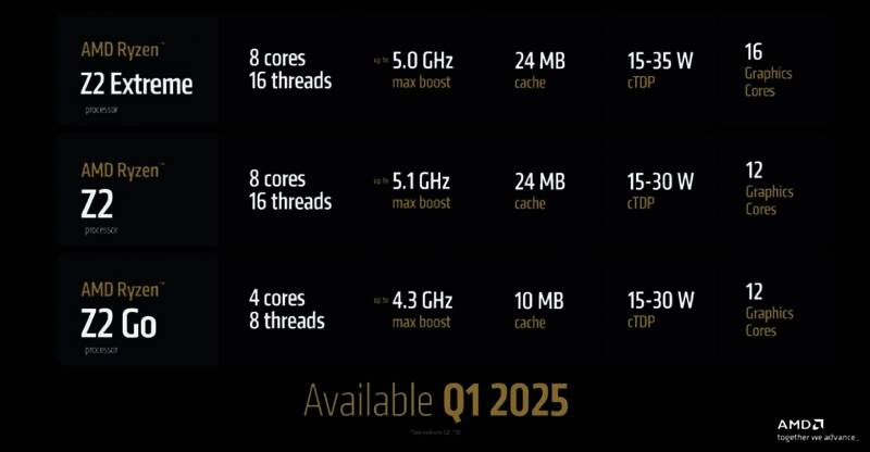 AMD Zen 2 Extreme以及性能较低的兄弟产品Z2和Z2 Go均由Zen 5 CPU内核驱动。虽然Zen 2 Extreme使用基于RDNA 3.5的GPU,但Z2和Z2 Go仍分别使用RDNA 3和RDNA 2,为掌上游戏PC创造了一个完整的APU系列,有望降低掌上设备的价格。