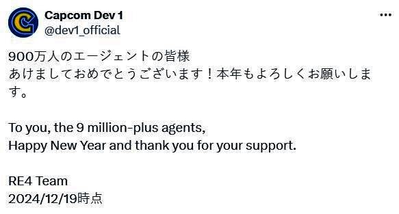 1月6日,卡普空第一开发部发文宣布,截止到2024年12月19日,《生化危机4:重制版》全球销量已突破900万份,庆祝贺图同步公开。