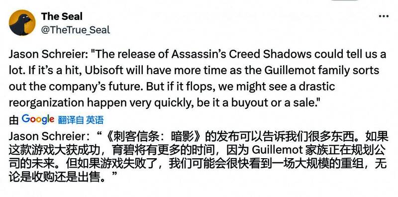 他说:“《刺客信条:影》的推出可以告诉我们很多东西。如果这款游戏大获成功,育碧将有更多的时间,因为 Guillemot家族正在规划公司的未来。但如果游戏失败了,我们可能会很快看到一场大规模的重组,无论是收购还是出售。”