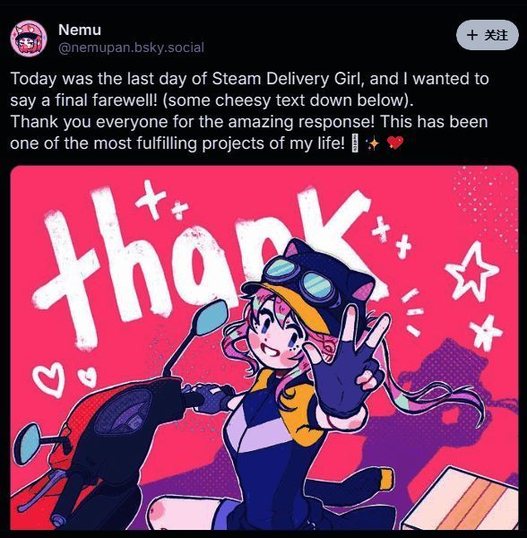 上个月Steam秋季特卖开启时,官方宣传中忽然出现了一位神秘女孩,满满的邻家女孩亲切可爱气质,引发玩家们热议,日前,这位女孩的作者,插画家Nemu宣布将暂时告别,感谢V社邀请自己参与创作。