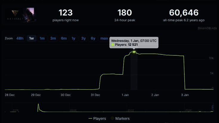 出于某些原因,已经“暴死”的《DOTA2》集换式卡牌游戏《Artifact》同时在线玩家人数突然激增。