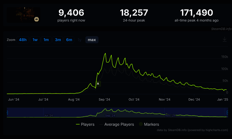 根据 SteamDB,就在过年第一天,游戏同时在线玩家突然增添到了 1.2 万人,但就在一天之后就消失了。一半来说,游戏的玩家仅有 100 人左右(是的,还有人在玩)。这种增幅并不正常,但并没有人给出背后的原因。