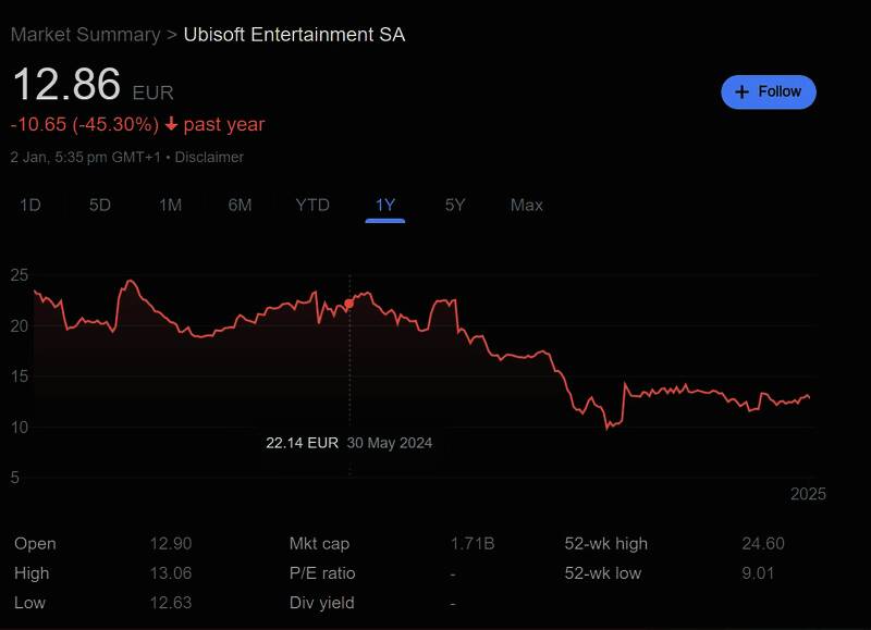 在过去一年里,育碧的股价已经下跌超过45%。这种急剧下滑引发了投资者和分析师的担忧,显示出人们对该公司的未来缺乏信心。2023年,育碧报告净亏损4.94亿欧元,其股价在过去五年里累计下跌了79.38%。