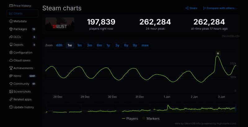 多人生存游戏《腐蚀(Rust)》在发售11年后,Steam同时在线玩家打破记录。据SteamDB显示,《腐蚀》当前在线19.7万人,24小时峰值来到了26.2万人,是有史以来最高峰值。