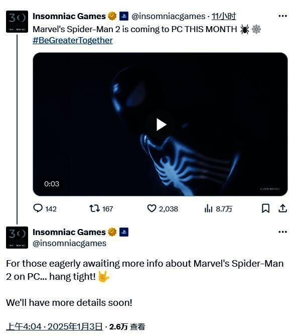 《漫威蜘蛛侠2》PC版即将于1月31日发售,根据失眠组Insomniac Games的最新消息称,关于该作的预购等更多细节信息即将公布。