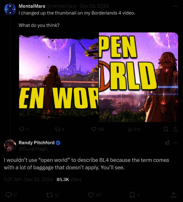 采用虚幻5引擎打造的动作射击游戏《无主之地4》将在2025年年内推出。近日开发商Gearbox的首席执行官Randy Pitchford在推特上纠正了将《无主之地4》称之为开放世界的说法,并表示“这个术语带有许多不适用的含义”。