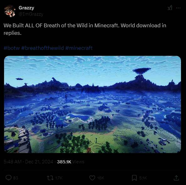 最终Grazzy赶在2024年年底之前成功将《塞尔达传说:旷野之息》的整个地图搬进了《我的世界》游戏中。