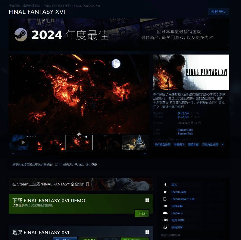 《最终幻想16》实际上是2023年的游戏,首发于PS5平台,后于2024年9月登陆了Windows PC