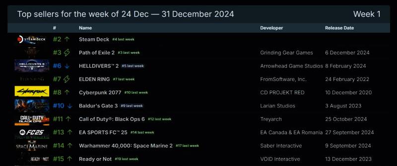 Steam最新一周销量榜出炉(2024年12月24日-2024年12月31日,无免费游戏),本周《流放之路2》滑落至第二位,Steam Deck成功登顶。