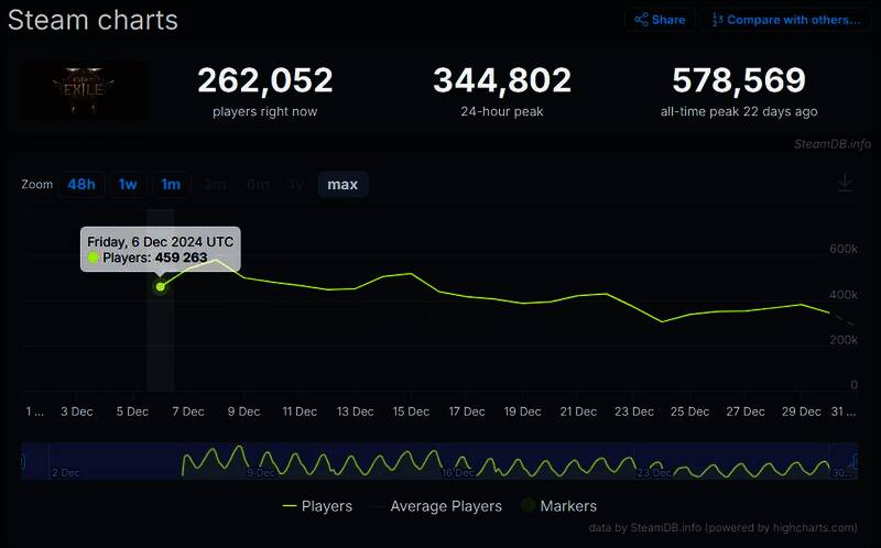 在本月推出抢先体验版本的类暗黑刷子游戏《流放之路2》,根据SteamDB的统计数据,游戏推出的首日其Steam平台的在线峰值就接近46万,可谓是现象级作品。