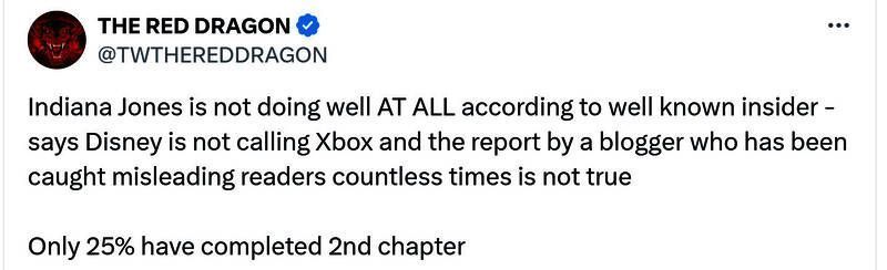不过,对于这一传闻,X上也有人表示这不是真的。也有传闻称,实际上《夺宝奇兵》的表现一点也不好,迪士尼并没有给Xbox打电话,而那个被发现一直误导玩家博主的报道也不是真的。