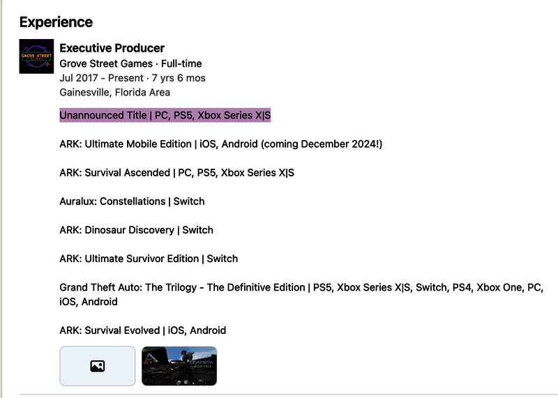 当然,以上仅仅上猜测,或许这款新作完全不是《GTA》IP。Jordan Kleeman的领英简历还显示,Grove Street Games还负责移植了《方舟:生存进化》的iOS,安卓,Switch版本,以及《方舟:生存飞升》的PC,PS5,Xbox Series X|S开发工作。