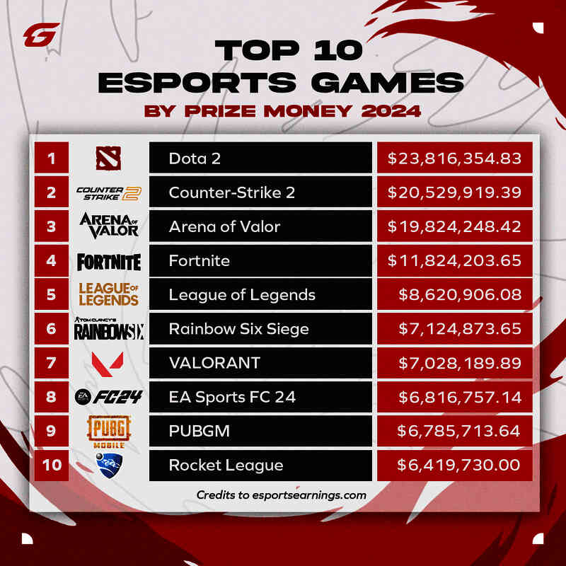 外媒GosuGamers发布了2024年赛事奖金最高的十大电竞游戏,《DOTA2》依旧保持榜首位置,虽然TI奖金几乎是腰斩。