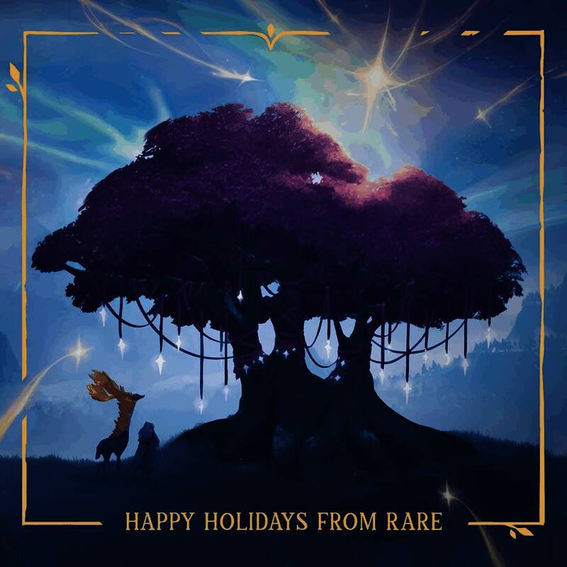 Rare在Instagram上发布了一条节日祝福消息,同时还展示了这款游戏的新艺术图。这幅新艺术图展示了明亮天空下的一棵大树,以及一个人物和一只神秘的鹿状生物站在树的阴影下。显然,这并没有透露太多游戏本身的内容,但它确实让我们再次瞥见了其追求的美学风格。请看下方图片。