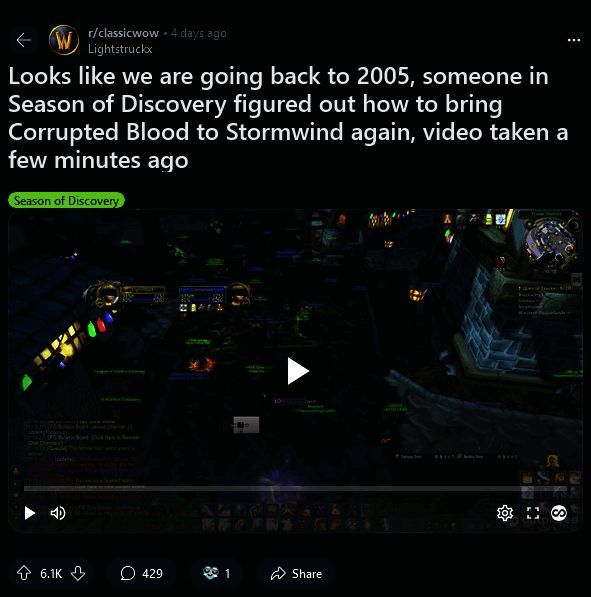 在 2005 年,《魔兽世界》中发生了一场之名的“数字瘟疫”。一个名叫“堕落之血”的 Debuff 最初感染了 400 万名玩家后,让整个游戏世界成为了荒芜的末世。暴雪直到一个月后才将问题解决。而如今,在《魔兽世界:怀旧服》中,又有玩家在试图再现这场瘟疫。