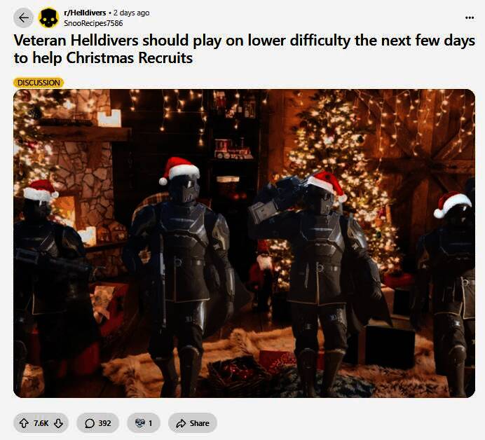名为“SnooRecipes7586”的reddit用户最先在“绝地潜兵”板块发帖,建议老玩家们可以在圣诞节期间去游玩低难度的任务,以此来“征兵”(指保留住新玩家)。