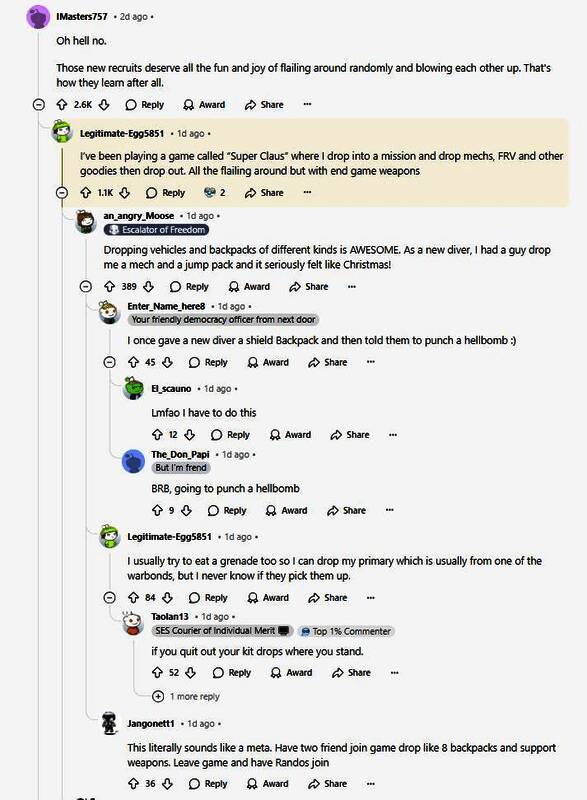 不过很快就有名为“Legitimate-Egg5851”的玩家在底下留言表示他自己会在新人玩家的游戏中出现,然后像圣诞老人一样丢下机甲、FRV等游戏中后期才能解锁的物品留给新人玩家使用,接着便退出。