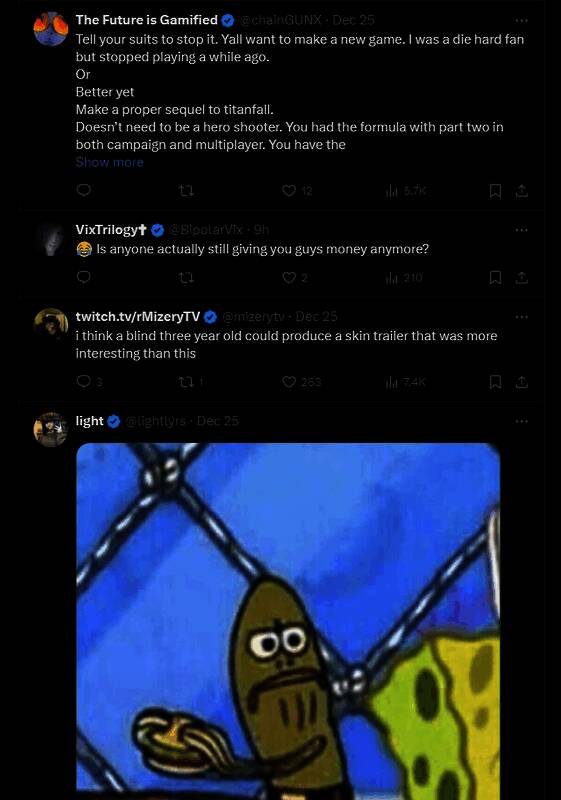 近日在《Apex英雄》官方推特中发布有关皮肤等内容新年促销的推文下,许多玩家表达了对这款游戏的失望。不仅有人表示将要放弃《Apex英雄》,还有玩家指出作为实时服务游戏目前已经“不再有趣”,甚至还有玩家表示重生不要再出这些皮肤,而是时候考虑制作一款《泰坦陨落》的新作了。