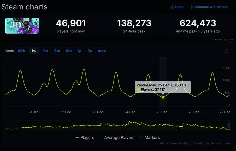 而通过SteamDB的统计数据可以看出,虽然《Apex英雄》的峰值人数还能有13万人以上,但在圣诞节期间游戏在Steam平台的最低峰值人数不足4万人。相较于60多万的在线最高峰,《Apex英雄》的玩家数近年的确下滑严重。