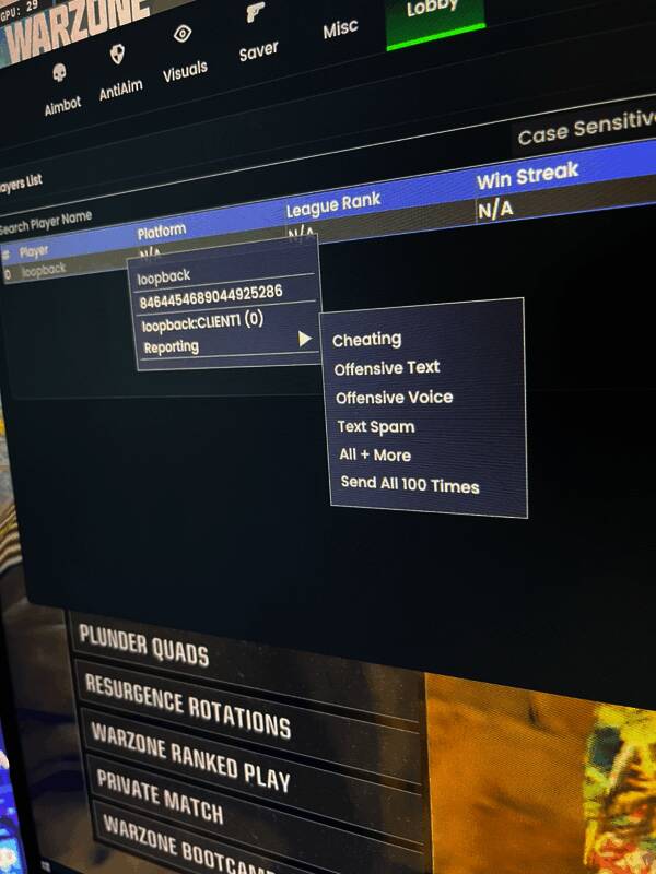 最近有许多《使命召唤》玩家发现,当他们在游戏中击杀外挂使用者后,却反而被踢出游戏。有人将相关片段放上网,引起热议、其似乎是用了一种新的作弊工具,只要按下一个按钮,它就可以重复检举同一名玩家100次,从而触发《使命召唤》反作弊机制RICOCHET审查,让正常玩家无法在审查期间玩游戏。