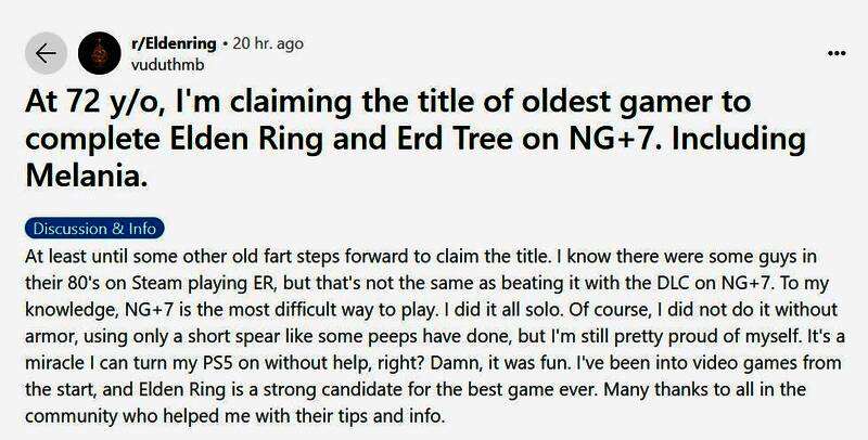Reddit用户vuduthmb声称自己是完成《艾尔登法环》本体和《黄金树之影》DLC八周目难度的最年长玩家,这需要总共通关八次游戏。他开玩笑表示将一直卫冕这一这个头衔“直到其他老家伙站出来挑战。”《艾尔登法环》的多周目并不意味着一定会变难,但八周目确实相比一周目要困难很多。