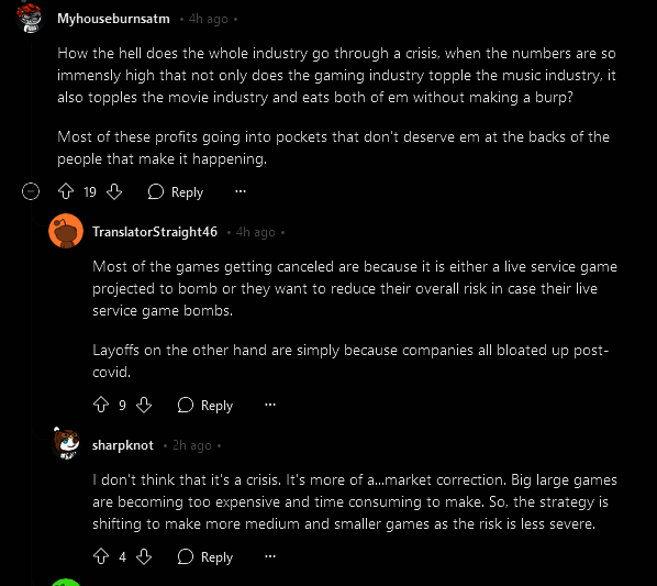 正如一位玩家指出,许多被取消的项目都是因为公司一开始想要乘上实时服务游戏的“东风”,但是现在已经时过境迁玩家不买帐了,因此游戏公司想要降低风险;而另一方面,在疫情期间游戏产业突飞猛进,公司也开始大量扩招,但实际上市场有限,现在的“裁员潮”实际上也只是市场的自我调整。
