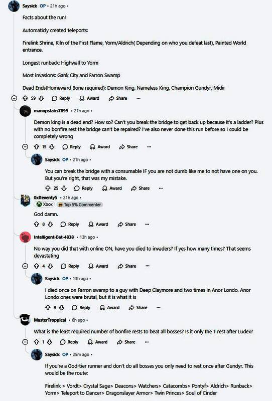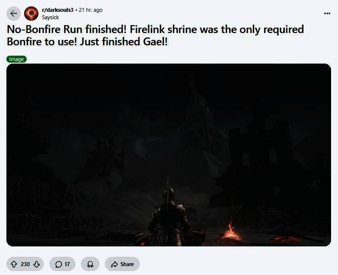 因此这位名叫“Saysick”的reddit就已仅使用传火祭场的篝火的条件,来达成不使用篝火通关游戏的挑战,并且顺利击败奴隶骑士盖尔。