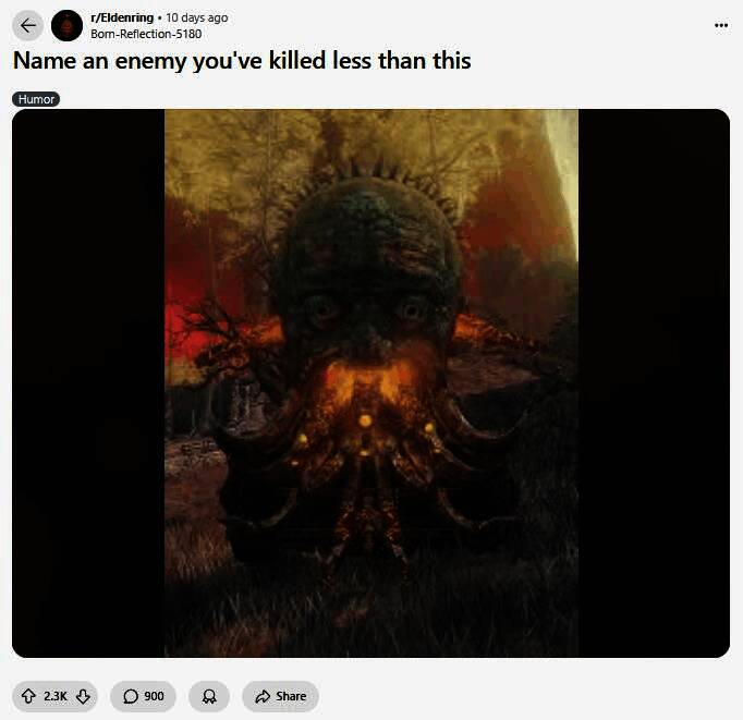近日有位名叫“Born-Reflection-5180”的reddit用户在“法环”板块发帖提问:“说出一个你杀死的比这个怪还要少的敌人”,并配了一张游戏中喷火战车类型的怪物的图片,从而得到了大量网友的回复及讨论。