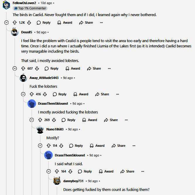 这个回答得到了许多人的赞同,不过名为“Deus85”的玩家很快补充说盖利德地区由于玩家总是太早到达所以会变得十分困难,而最令其不想交手的敌人,其实还是被玩家调侃为“虾薪王”的巨型龙虾类敌人。