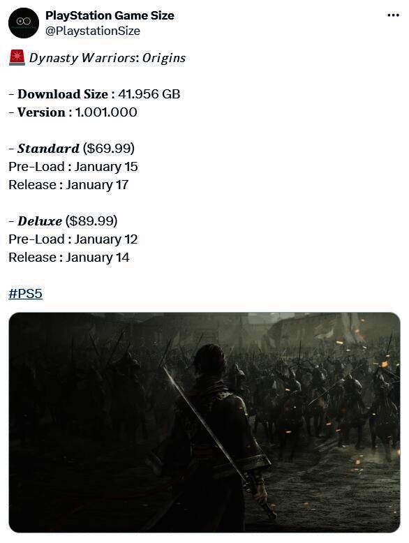 知名推主PlayStation Game Size近日发文透露,《真三国无双:起源》PS5版的下载容量大小为41.956GB,版本号1.001.000,标准版预计1月15日开启预载,1月17日解锁,豪华版将提前3天,1月12日开启预载,1月14日解锁。